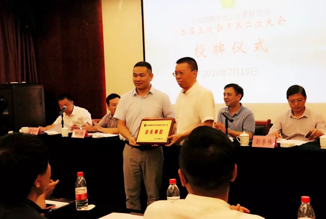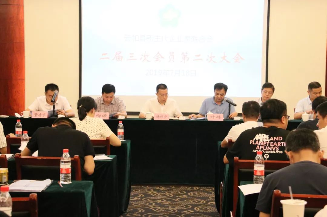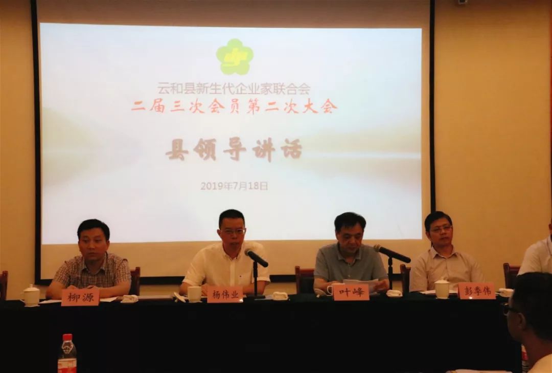 2019年7月18日下午,云和县新生代企业家联合会二届三次会员大会在华威国际大酒店云和厅召开。县委常委、统战部长杨伟业,县工商联主席叶峰、党组书记柳源、副主席彭季伟等出席会议。