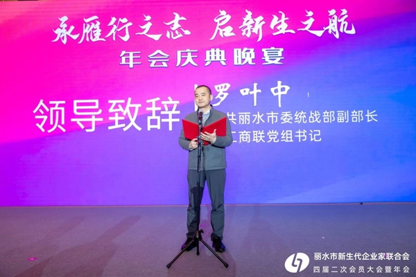罗叶中书记在会上致辞,他充分肯定了一年来丽水市新生代联合会取得的工作成效,指出,“丽水市新生代企业家联合是市工商联所属商会大家庭中的一面旗帜,走在了商会规范化建设队伍的前列”。他强调,“丽水市新生代企业家联合会积极开展服务品牌创建,以改革破题,实施“雁行接力”新生代企业家培养计划,着力解决新生代企业家接班“不想接、接不了”的问题”。他希望,“新生代企业家要坚定信仰,永葆革命精神,树立“浙商永远跟党走”的旗帜,做爱国敬业,诚信守法,自信自强的新时代优秀建设者。要继承初心,不减创业激情,把老一辈企业家的“不怕吃苦、敢为人先”创业精神传承发扬下去。要与时俱进,聚合创新动力,坚定发展信心,主动求新求变,通过持续推进技术、管理、制度、模式创新,实现逆势增长”。