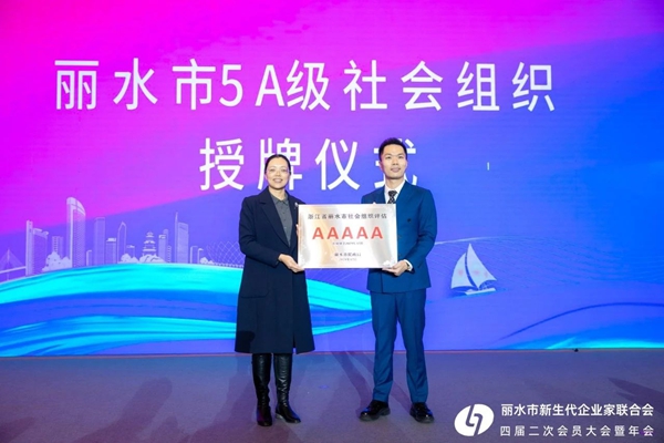 丽水市民政局局长廖旭青为联合会荣获“5A级社会组织”颁发牌匾。