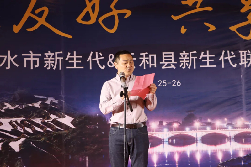 联谊活动上,云和县新生代企业家联合会游小卫会长,首先代表承办方致欢迎词,他说“在这个新时代,我们新生代面临着新的挑战,但更多的是新机遇,这次活动的主题是缔结友好、共享共赢,希望大家玩的开心,多多交流,通过本次活动更加增进两会会员的交流与友谊,实现共享共赢”。