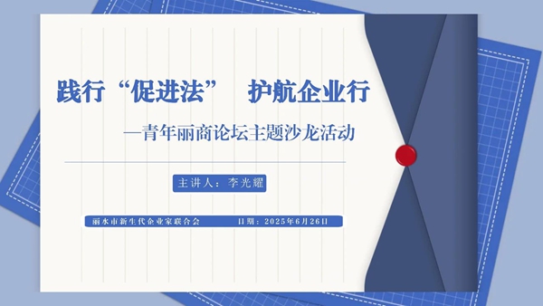 5月20日,《民营经济促进法》正式施行,标志着我国民营经济发展迈入法治化新阶段。为帮助会员企业把握政策机遇、提升合规经营能力,6月26日,丽水市新生代企业家联合会成功举办"践行促进法 护航企业行"——青年丽商论坛主题沙龙活动,吸引会员及会员企业代表60余人参加。