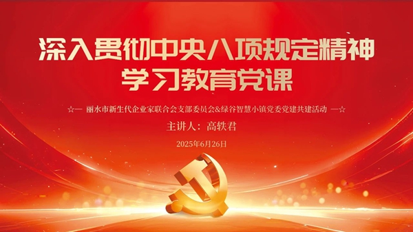 为深入贯彻落实中央八项规定精神,强化党员干部纪律作风建设,6月26日,丽水市新生代企业家联合会支部委员会与绿谷智慧小镇党委联合开展党建共建活动,以专题党课形式组织党员深入学习中央八项规定精神。此次活动由丽水市新生代企业家联合会支部委员会支部书记高轶君主讲,来自两个党组织的 60 余名党员、会员参加学习。