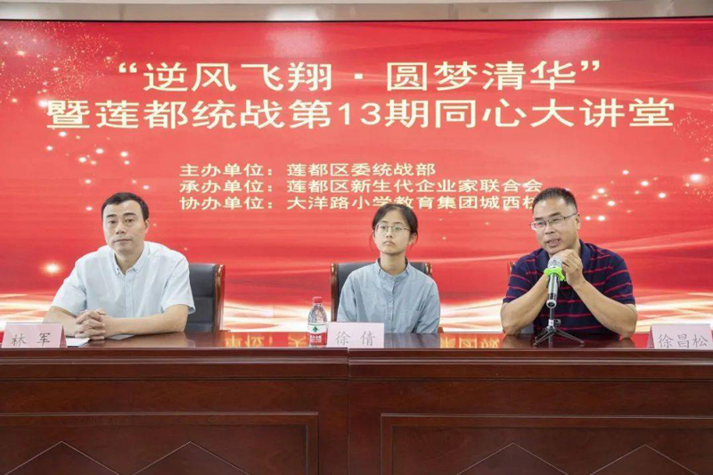此次“同心大讲堂” 以“逆风飞翔·圆梦清华”为主题,邀请了今年以694分被清华大学录取的徐倩同学以及她的班主任徐昌松老师进行授课。区委常委、统战部长翁伟标出席会议,区委统战部常务副部长林军主持会议,各统战团体成员150多人参加。