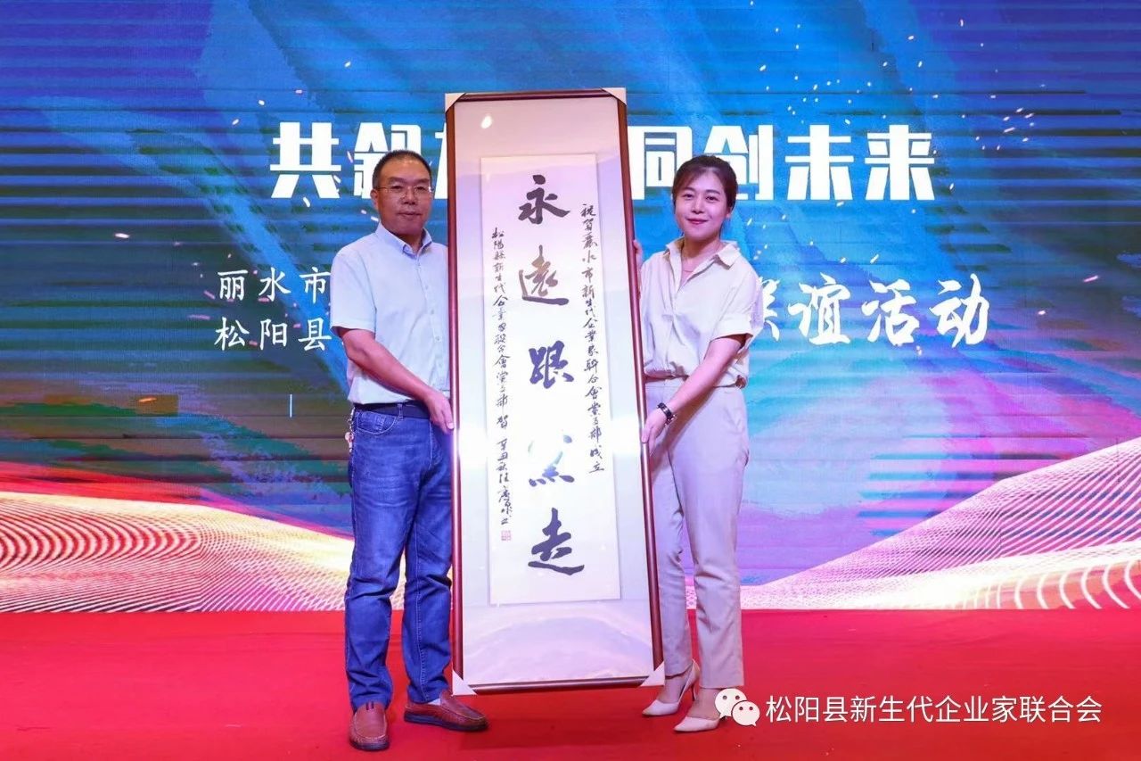 松阳县新生代企业家联合会党支部向即将成立的丽水市新生代企业家联合会党支部赠送松阳县书法家协会主席汪清泉先生创作的一副书法作品表示祝贺。