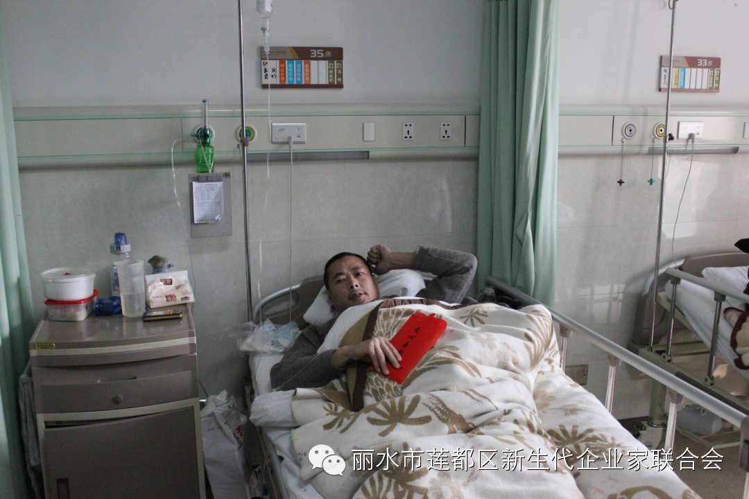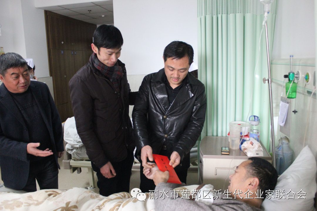 2015年1月17日上午,莲都区新生代企业家联合会会长陈旭东、秘书长李伟杰与区慈善总会会长朱祖新、区残联党组书记、理事长李冠武等一行来到丽水市中医院看望并慰问了身患败血症的残疾人张云勇。会长陈旭东、秘书长李伟杰代表区新生代企业家联合会全体会员为张云勇送上了1万元的救助金,并鼓励他树立战胜疾病的信心,争取早日康复。